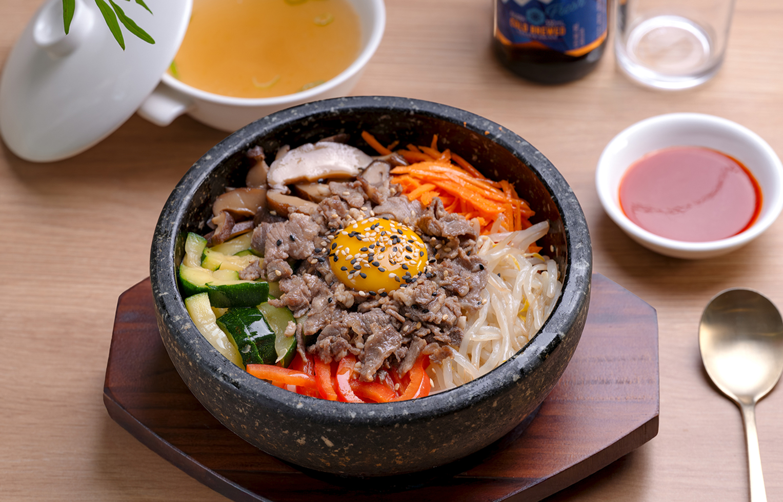 Bol de riz chaud garni de légumes, viande ou tofu, œuf et sauce gochujang.